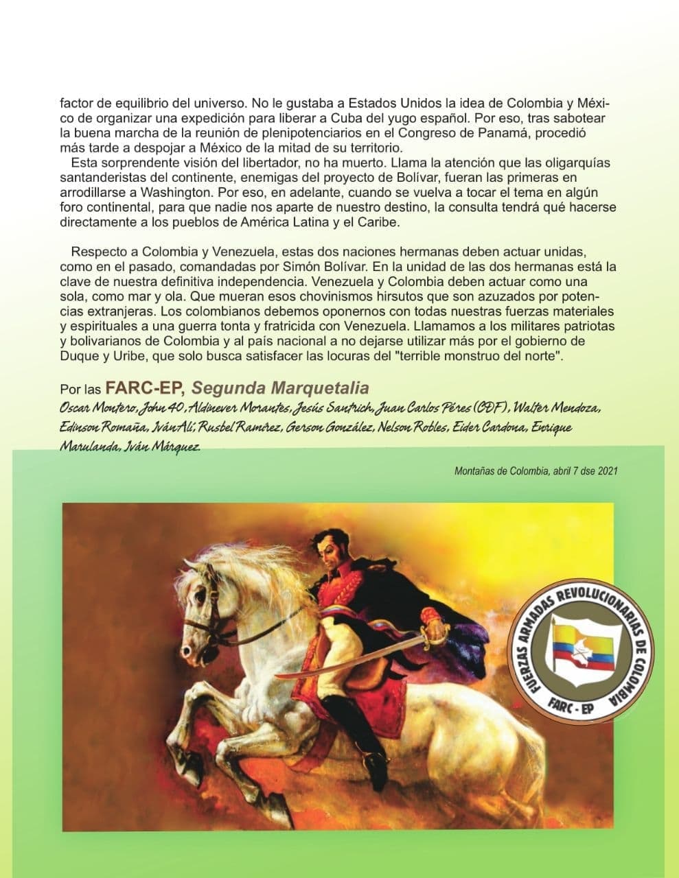 The FARC-EP, Second Marquetalia, a force inspired by the thoughts of the Liberator Simón Bolívar, reiterates that it does not act militarily against the armed forces of neighboring countries; that they respect the sovereignty of their governments and peoples as something sacred; they do not tax any of the nationals of those countries, much less interfere in the sovereign management of their natural wealth.