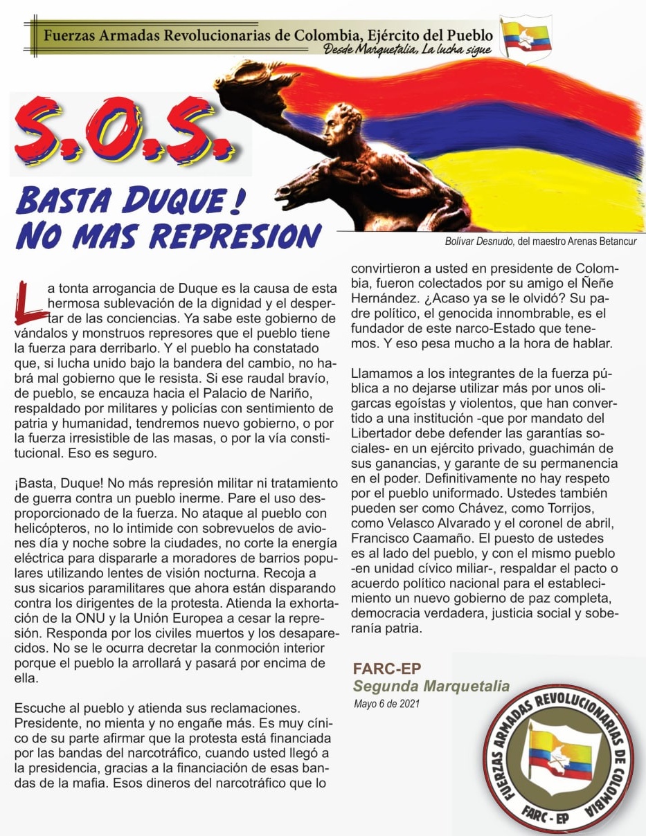 Enough, Duque! No more military repression or war crimes against defenseless people. Stop the disproportionate use of force. Don’t attack the people with helicopters, don’t intimidate them with overflights of planes day and night over the cities, don’t cut the electricity to shoot residents of popular neighborhoods using night vision goggles. Pick up your paramilitary hitmen who are now shooting at the protest leaders. Heed the call of the U.N. and the European Union to stop the repression. Answer for the dead and missing civilians. Don’t imagine decreeing away the internal upheaval, because the people will overwhelm it and pass over it.