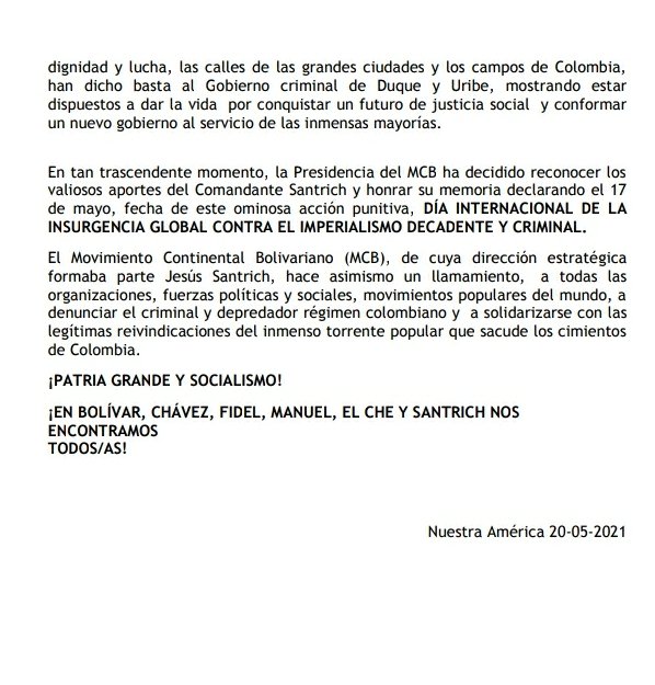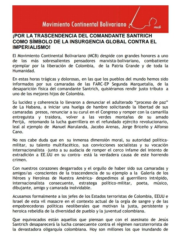 The Bolivarian Continental Movement (MCB), whose strategic direction Jesús Santrich was part of, also calls on all organizations, political and social forces, and popular movements of the world, to denounce the criminal and predatory Colombian regime and to stand in solidarity with the legitimate demands of the immense popular torrent that shakes the foundations of Colombia.